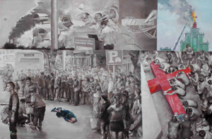 “赛先生”今日的境况又如何呢?离开了“德先生”的监督和保护,它成为了伤害人尊严的工具。画面上方偏右的位置,我们可看见一只握着手术刀正在修改基因图谱的手;一对经基因改造后出生的双胞胎女婴;以及贺建奎的背影,正是他进行了这桩严重违背人类道德伦理的“科学行为”。科学是人类理性的工具,这一工具帮助人类在寻求和建造物质生存状态、环境方面获得越来越高的成就。但人的理性和科学如果仅仅是为了满足生存需求,在康德(著名德国哲学家)看来就和动物的爪牙没有什幺区别,不过更锋利而已。人区别与动物就在于他的灵性(或称神性)。这是人性的超越性向度,是构成人的道德品格的首要条件和根基,可以说没有灵性便无道德。离了对神的敬畏和荣耀,也就失了超越向度和灵性,最终失了道德品格,正如大地上今天道德全面滑坡的真实状况。画面的左面我们可以看到安装在柱子上的人面监控镜头,以及造成空气污染的废气排放,都是在告诉人们,离了道德规范的环境,先进的科学技术都会造成对人的尊严的侵害。